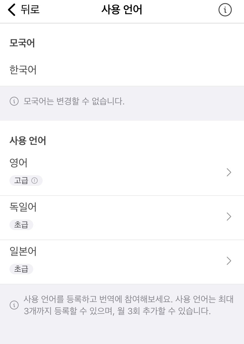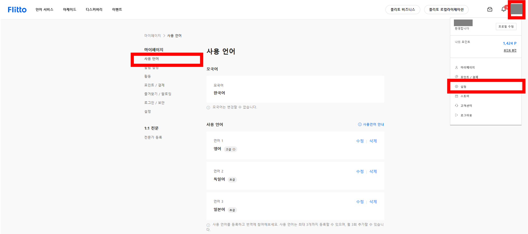 - 마이페이지가 나오면 '사용언어'에서 모국어, 사용언어를 선택 가능