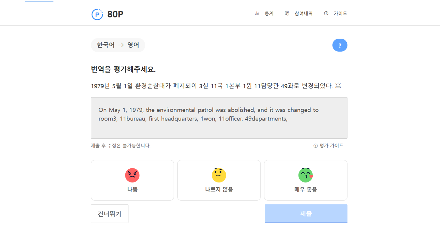 중급자 이상부터는 보다 긴 문장이 나오는 것 같습니다. - 번역을 보고 3가지 평가(나쁨, 나쁘지 않음, 매우 좋음) 중 하나를 선택