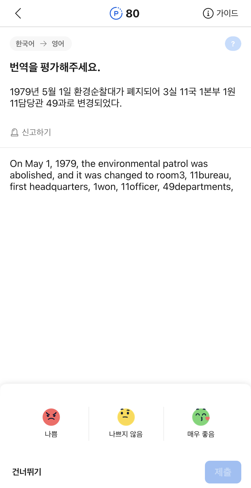 (나쁨과 나쁘지 않음을 선택할 경우 직접 문장을 고쳐야 한답니다ㅎㅎ!) - 잘 모르겠을 때는 ‘건너뛰기’를 사용합니다.