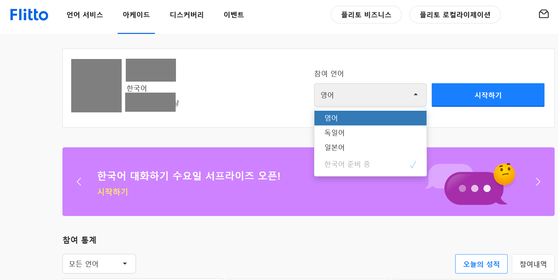 - '참여언어'를 '영어'나 '일본어'를 선택하고 '시작하기' 버튼을 누름