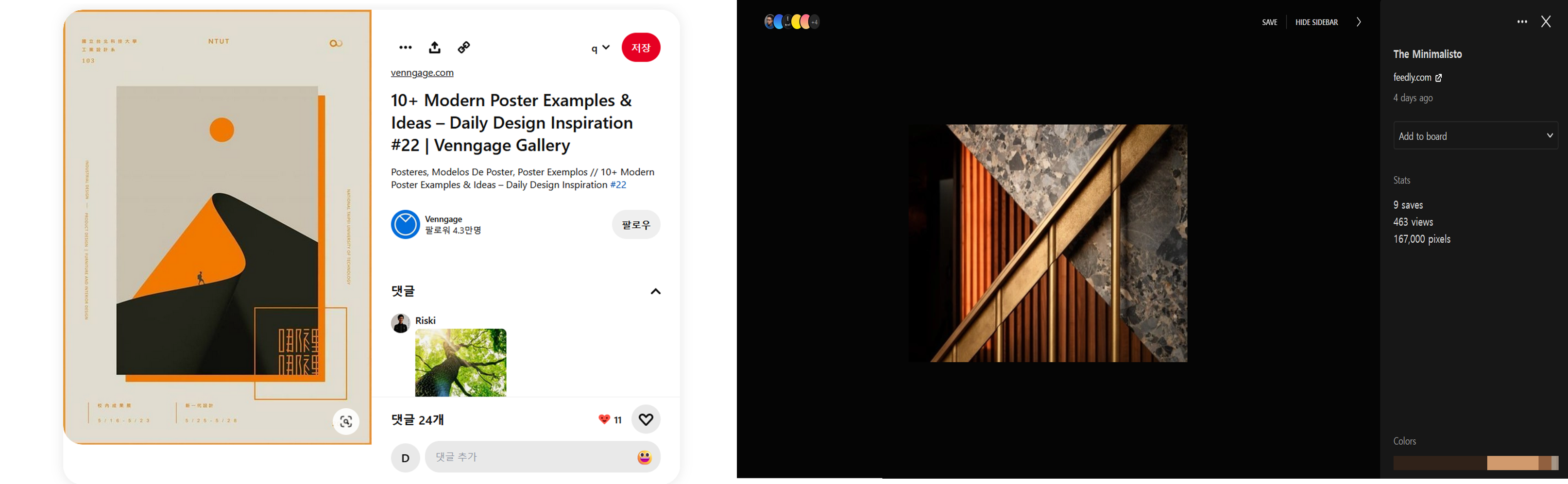 검색 화면에 나온 포스터와 사진을 각각 클릭했을 때 나오는 세부 화면입니다. 두 웹사이트의 기능은 거의 비슷하지만 사용자가 보다 쉽고 직관적으로 이용하기에는 아직까지 핀터레스트가 우세합니다. 일단 글자 포인트부터 차이가 나니까요. 그렇지만 Savee가 가진 큰 이점이 있다면 오른쪽 하단에 위치한 '컬러칩' 기능이 아닐까요. 선택하는 모든 이미지의 컬러 조합이 나와서 디자이너들에게 꽤나 괜찮은 레퍼런스로 활용될 수 있어 보입니다.