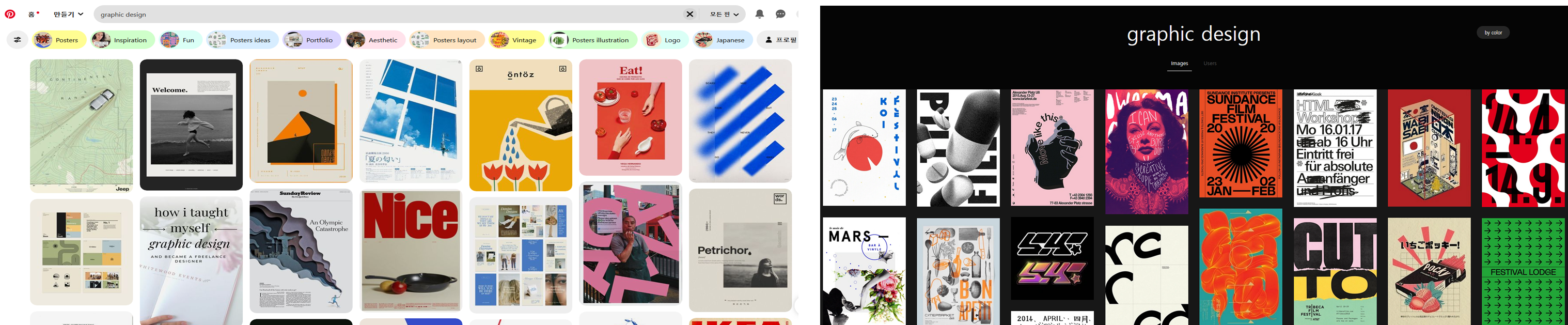 두 웹사이트를 나란히 놓고 볼 때 지향점이 확연히 다르다는 걸 알 수 있습니다. graphic design이라는 검색어를 입력한 결과가 위의 화면인데요, 핀터레스트의 사용자가 압도적으로 많기 때문에 가능한 일이기도 하지만 레퍼런스와 검색 결과물이 보다 다채롭습니다. 아마 유저층도 Savee에 비해 다양하기 때문인 것 같구요. 또한, 더 많은 추천 키워드를 제공하는 핀터레스트의 방식 역시 유저 접근성을 높이는 데에 큰 도움이 되는 부분입니다.