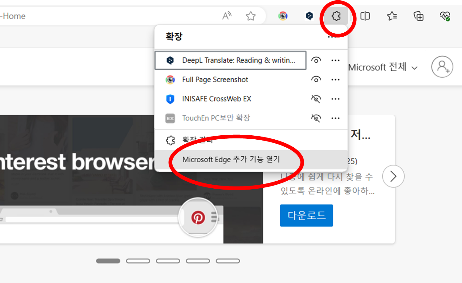 - 엣지 브라우저 > 상단바의 조각 모양 > Microsoft Edge 추가 기능 열기