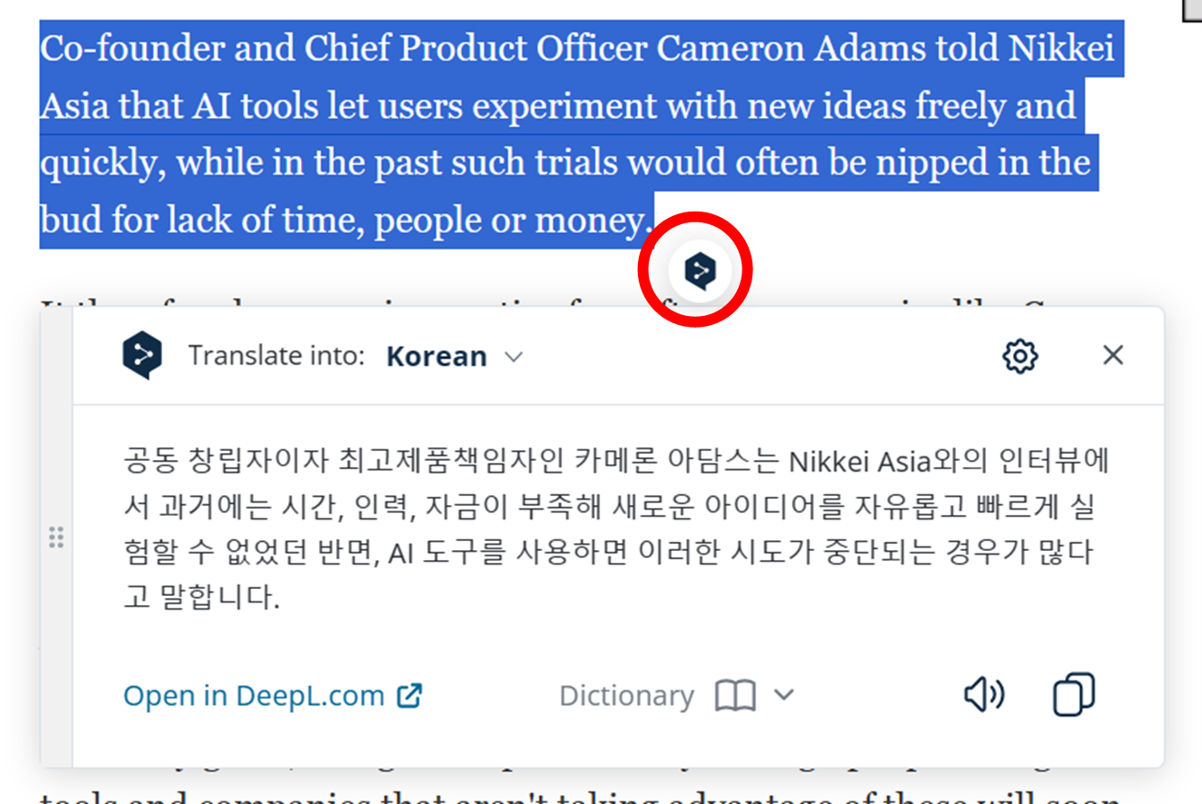 - 기사, PDF 등 웹 상에 게시된 다양한 언어에 블록을 설정하면 자동으로 DeepL버튼이 활성화