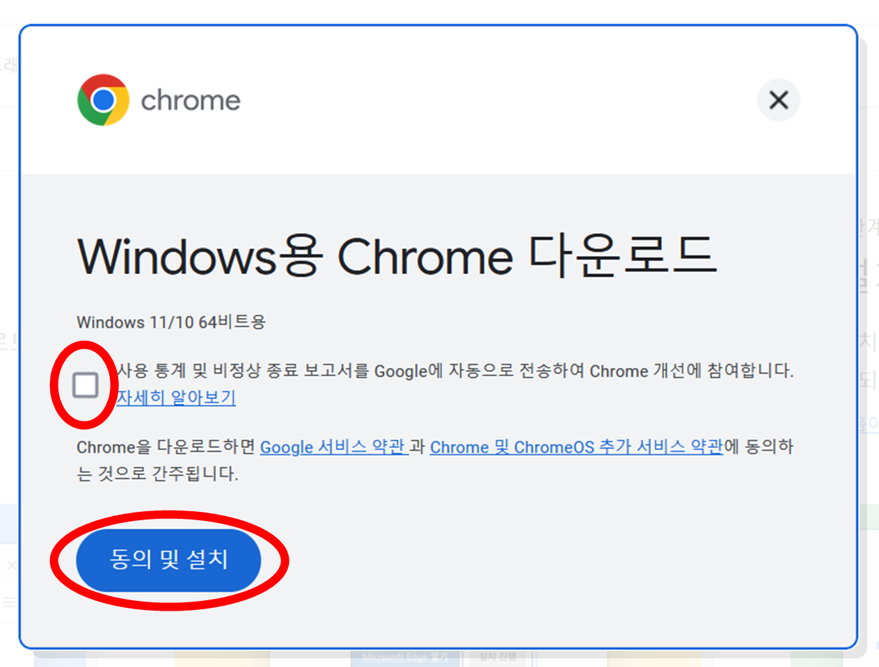 2. 크롬 다운로드 창이 나오면 필요에 따라 선택 여부를 체크합니다. 그리고 동의 및 설치 창을 클릭합니다.