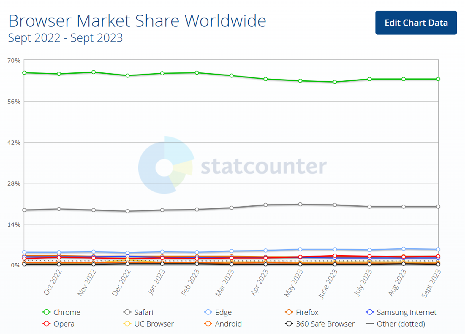 - 시장조사업체인 Statcounter에 따르면 전세계 브라우저 시장에서 크롬의 점유율은 2023.10 기준으로 63.45%, 1위를 달리고 있습니다.